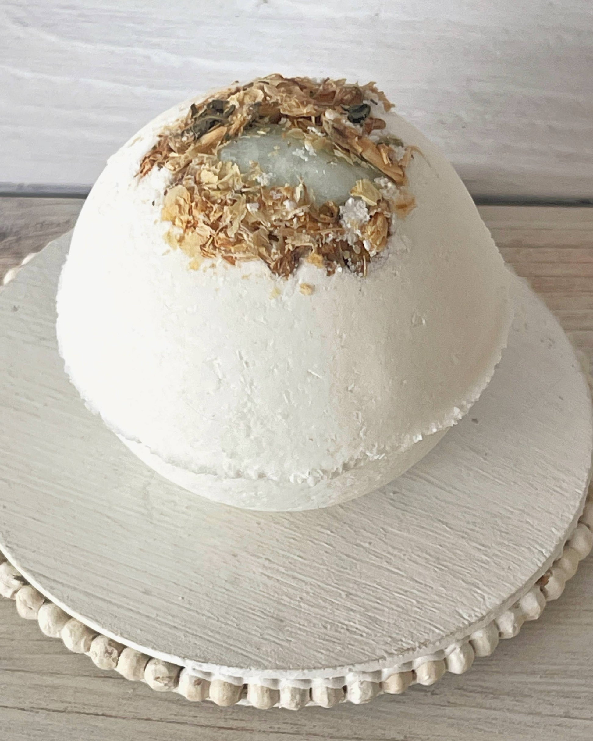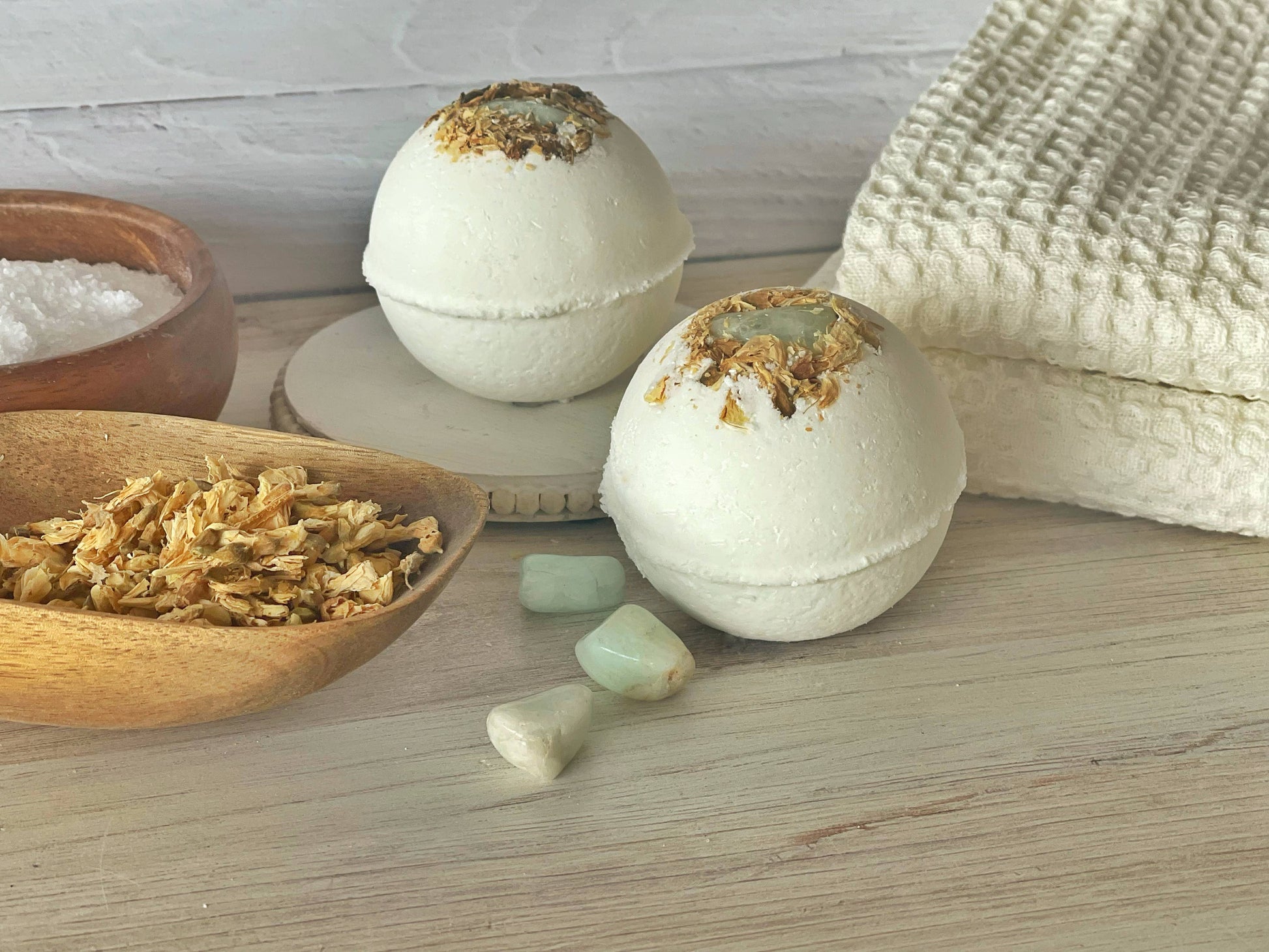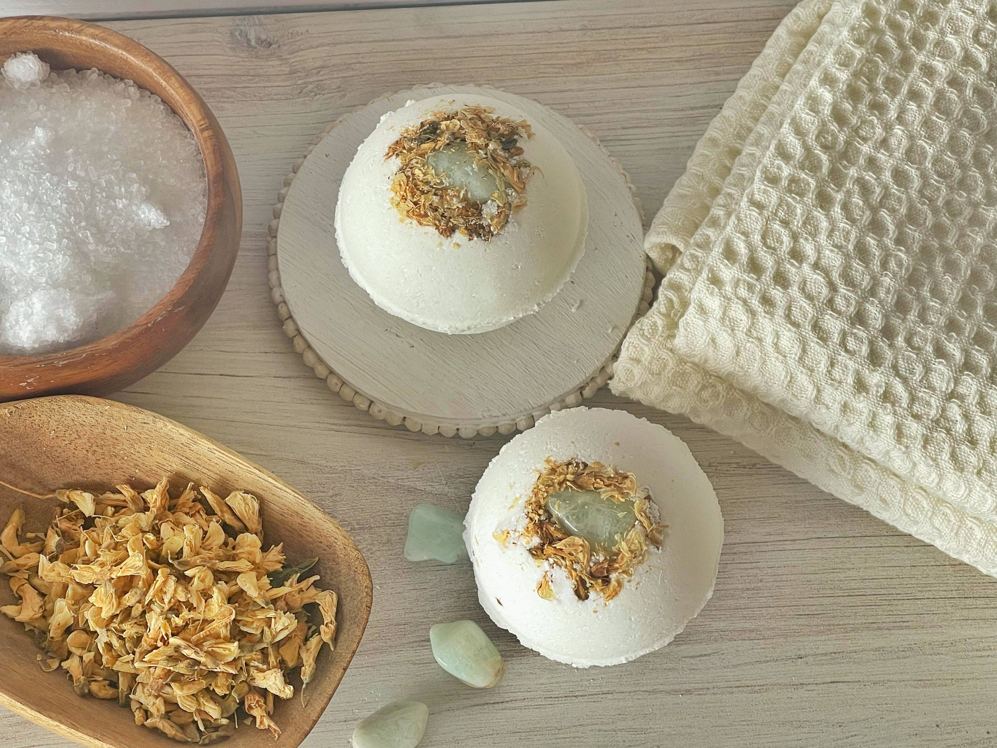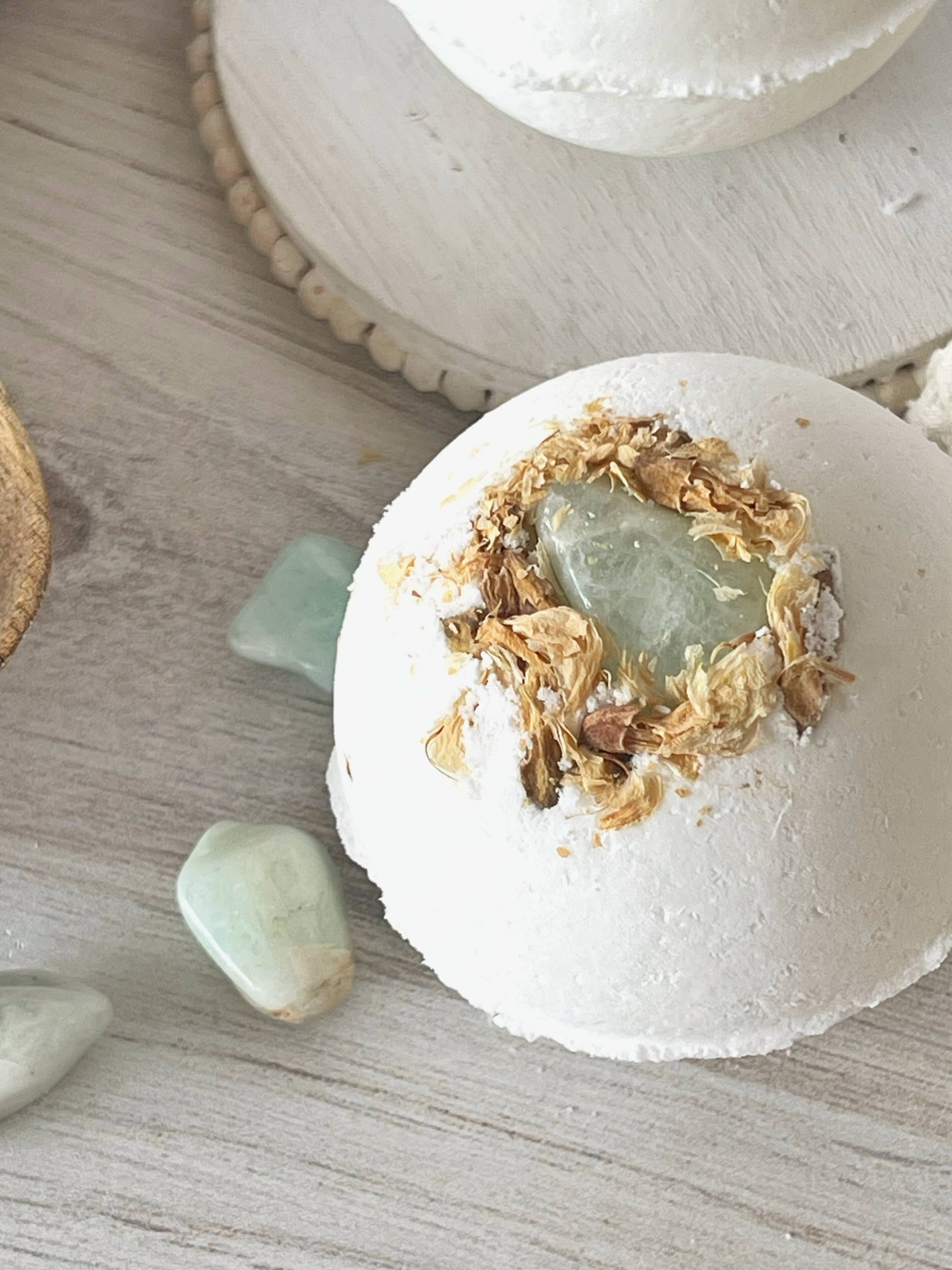 Enjoy a relaxing bath with an aquamarine bath bomb with dried sophora flowers. Made with organic ingredients.
