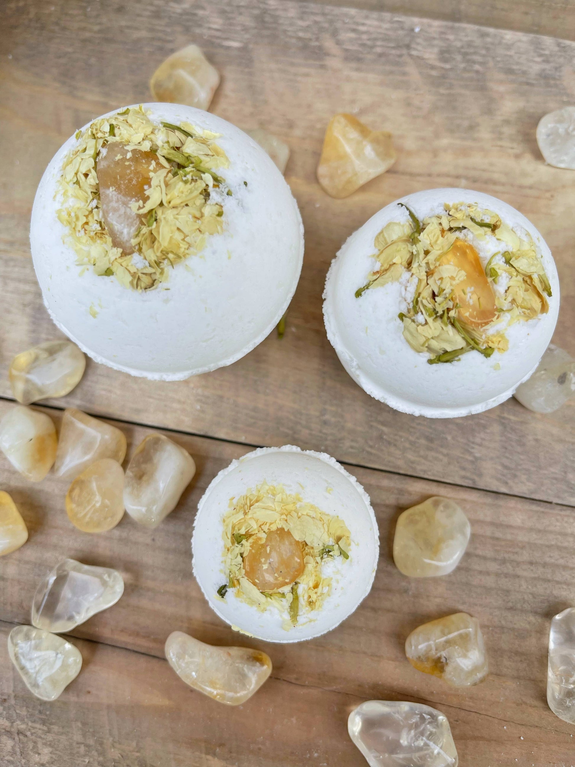 Enjoy a relaxing bath with a citrine & jasmine bath bomb. Made with organic ingredients. Save the citrine when you're done and carry it around with you for a boost in your self esteem & self confidence.