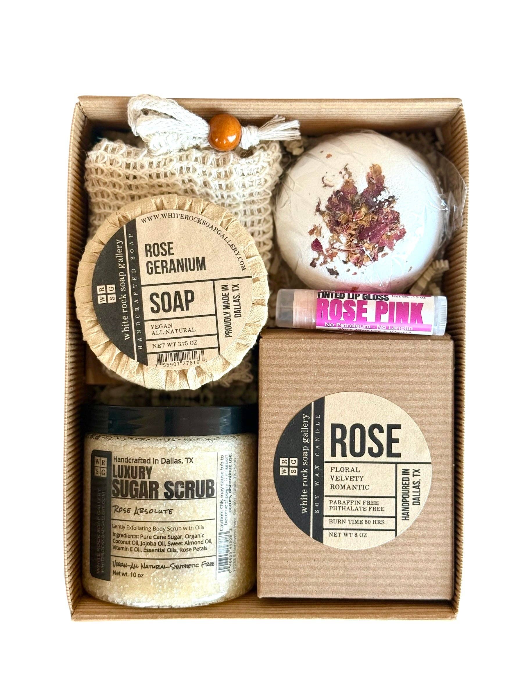What’s Inside: * 8 oz Rose Soy Wax Candle – Hand-poured with 100% American soy wax for a clean, long-lasting burn. * Rose Absolute Sugar Scrub (10 oz) – Exfoliates and nourishes skin with natural oils and rose absolute. * Rose Bath Bomb – Fizzes away stress while filling the bath with soothing rose aromas and gorgeous rose petals.